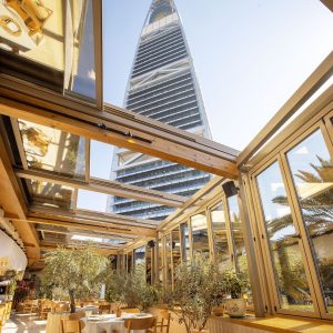 الإضاءة الناعمة، الطاولات الزجاجية، وخلفية السماء المتغيرة، كلها تجعل التجربة وكأنها “عشاء في الغيم”.