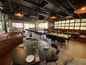 أجواء المطعم أنيقة، تمتزج فيها الإضاءة الدافئة مع الديكور العصري ليخلق إحساسًا بالفخامة الهادئة.